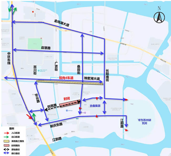 施工期间,经过创苑路(广贤街-桑田街)的机动车、非机动车和行人可选择独墅湖大道、金鸡湖大道、星华街、华云路、桑田街、长阳南街、新庆东路等周边道路通行。
