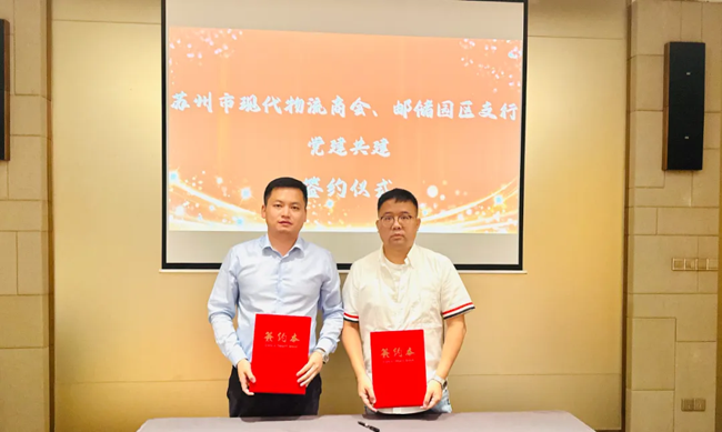 中共苏州市现代物流业商会党支部与中国邮政储蓄银行工业园区支行支部委员会举行了党建共建签约仪式。此次党建共建,旨在通过资源共享、优势互补,进一步加强双方的党建工作,以党建引领业务发展,实现互利共赢。