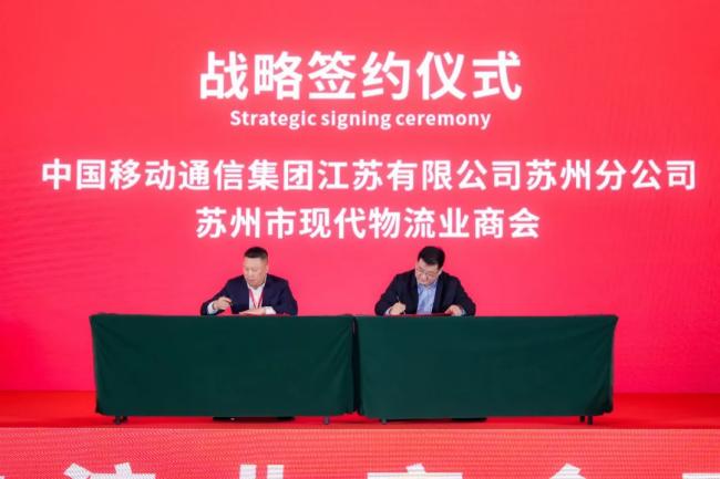中国移动通信集团江苏有限公司苏州姑苏区分公司政企客户行业总监王娴作了《从“连接”到“智联”:共筑苏州物流“智链新程”》主题分享。随后,中国移动苏州分公司与苏州市现代物流业商会签署战略合作协议,共同推动5G、算力网络等新一代信息技术与物流业深度融合。