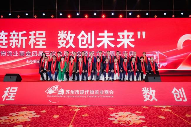 关注我们 廿载耕耘,智链同行。2026年3月28日,以“智链新程·数创未来”为主题的苏州市现代物流业商会四届三次会员大会暨成立二十周年庆典在苏州太湖国际会议中心隆重举行。大会回顾了商会二十载砥砺奋进的光辉历程,共绘行业高质量发展的宏伟蓝图。苏州市工商联、市民政局、市交通局、市商务局、宣城市交通运输局、相关金融机构、院校及行业企业的领导、专家、会员代表等嘉宾齐聚一堂,共襄盛举。
