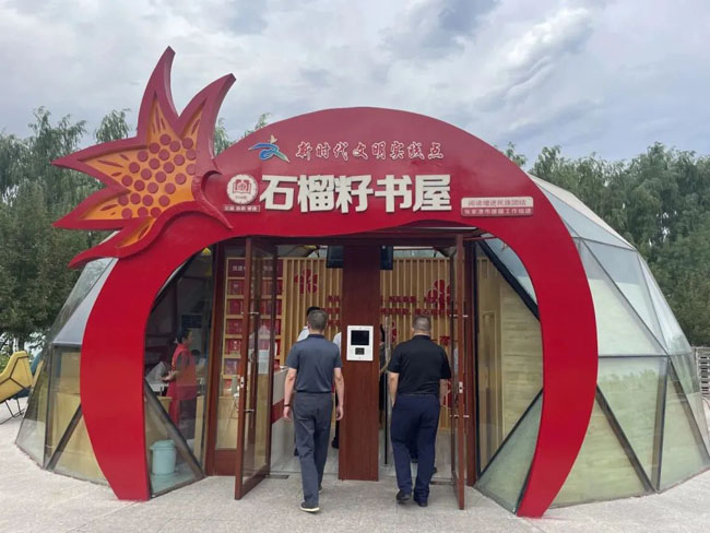 考察团一行先后来到张家港援疆项目巩留县公共服务中心和石榴籽书屋进行考察,在巩留县公共服务中心,考察团一行通过综合运用模型、视频图片及现代VR技术等,深入了解巩留县的历史文化、建设历程、未来规划、特色产业资源等方面情况。石榴籽书屋自2020年建成开放以来,就成了各族群众的精神文化家园。考察团一行对书屋的整体布局、特色服务、功能设置等情况进行了深入了解。据了解,在张家港市援疆工作组的大力支持下,近年来,全县已建成102座石榴籽书屋。